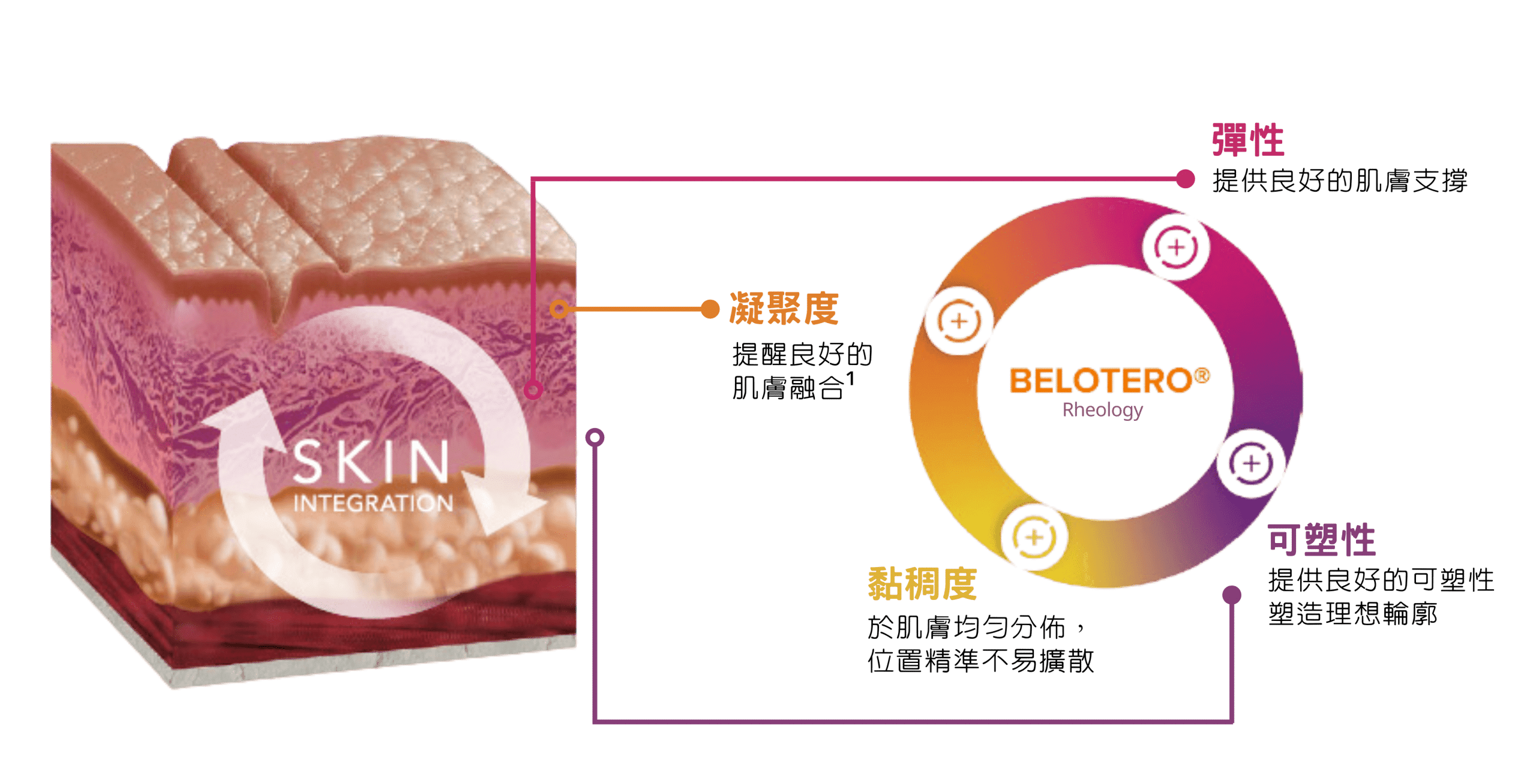 BELOTERO® 透明質酸系列的優勝之處在於其四大特點(凝聚度、黏稠度、彈性及可塑性)的均衡比例,能與肌膚融合,提供可預測的自然效果。