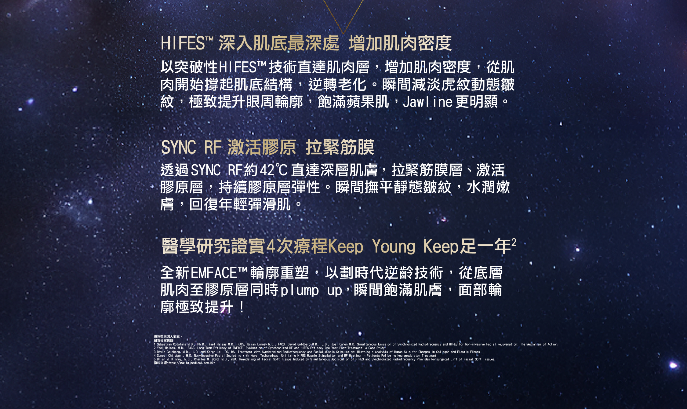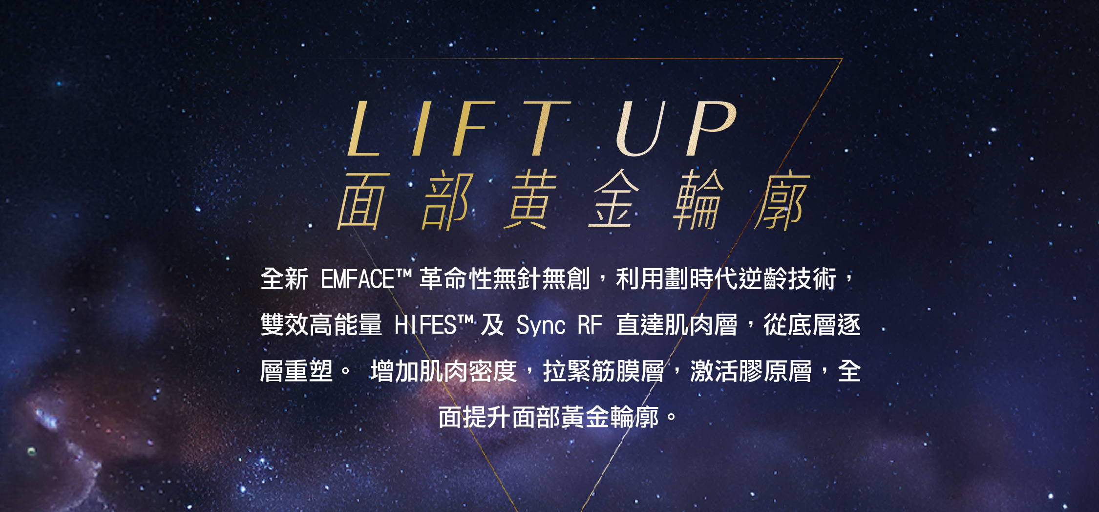 利用獨創 HIFES™ 技術直達面部肌肉神經元,刺激面部微細肌肉並強化密度。再配合 SYNC RF 以治療溫度約42°C 激活膠原及拉緊筋膜 (SMAS)。回復肌膚彈性,撫平皺紋,虎紋,緊緻提升蘋果肌,令肌膚回復年輕飽滿。