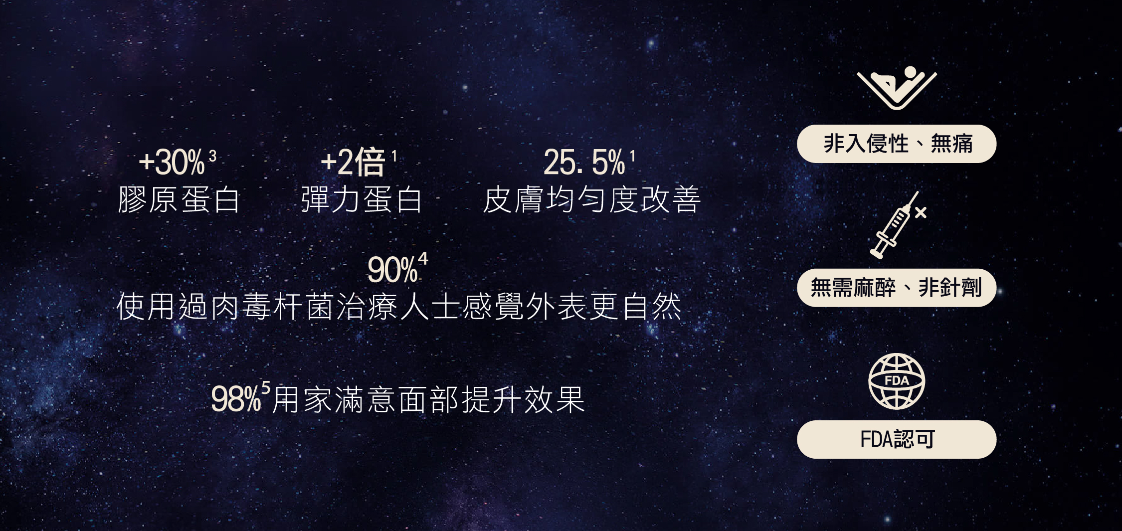 肌肉緊緻度+30%¹; 皺紋減少37%¹; 輪廓提升23%¹; 激生膠原26%¹; 改善肌膚均勻度25.5%¹; 增加2倍彈力蛋白¹