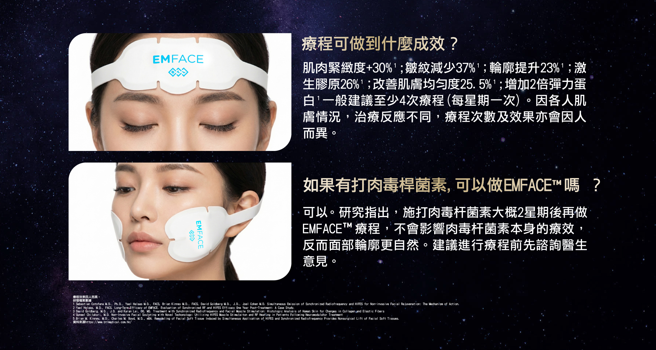 可以。研究指出,施打肉毒杆菌素大概2星期後再做EMFACE™ 療程,不會影響肉毒杆菌素本身的療效,反而面部輪廓更自然。建議進行療程前先諮詢醫生意見。