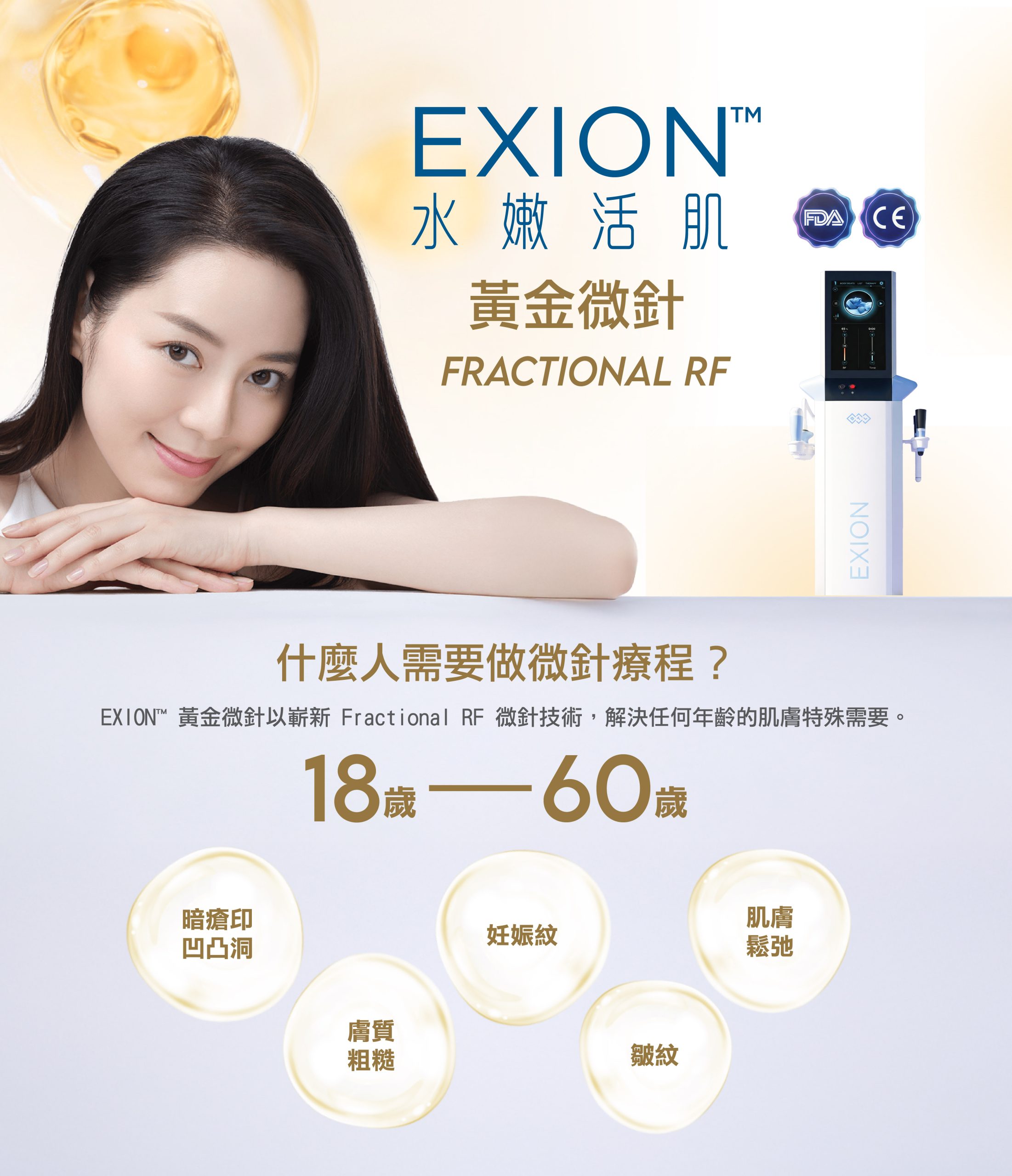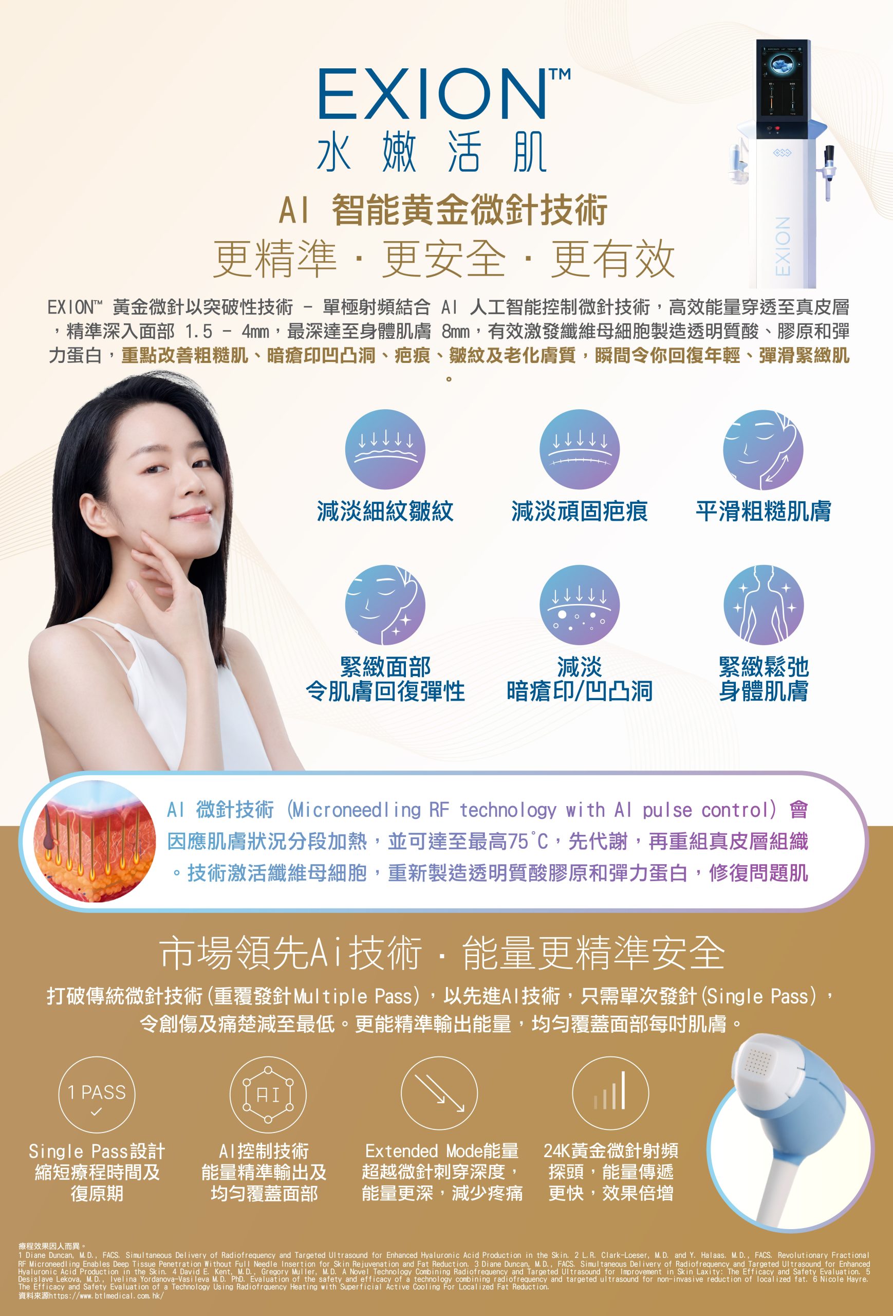 EXION™ 黃金微針以單極射頻 (Microneedling Monopolar Radiofrequency Technology) 結合 AI 人工智能 (AI pulse control) 控制微針技術,高效能量穿透至真皮層,精準深入面部 1.5 – 4mm,最深達至身體肌膚 8mm,有效激發纖維母細胞製造透明質酸、膠原和彈力蛋白,重點改善粗糙肌、暗瘡印凹凸洞、疤痕、皺紋、老化膚質及妊娠紋,瞬間令你回復年輕、彈滑緊緻肌。